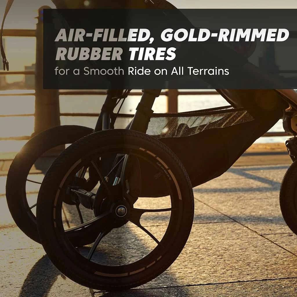 Visually, this stroller boasts luxurious details like vegan leather harness covers, reflective canopy accents, and elegant stitching that elevate its modern aesthetic. It includes air-filled rubber tires, a handlebar-mounted swivel lock, and Baby Jogger’s signature one-hand compact fold. It’s compatible with Baby Jogger, Graco, Chicco, and Peg Perego infant car seats when paired with appropriate adapters (sold separately), making it a flexible, stylish, and high-performance choice for modern parents on the move.