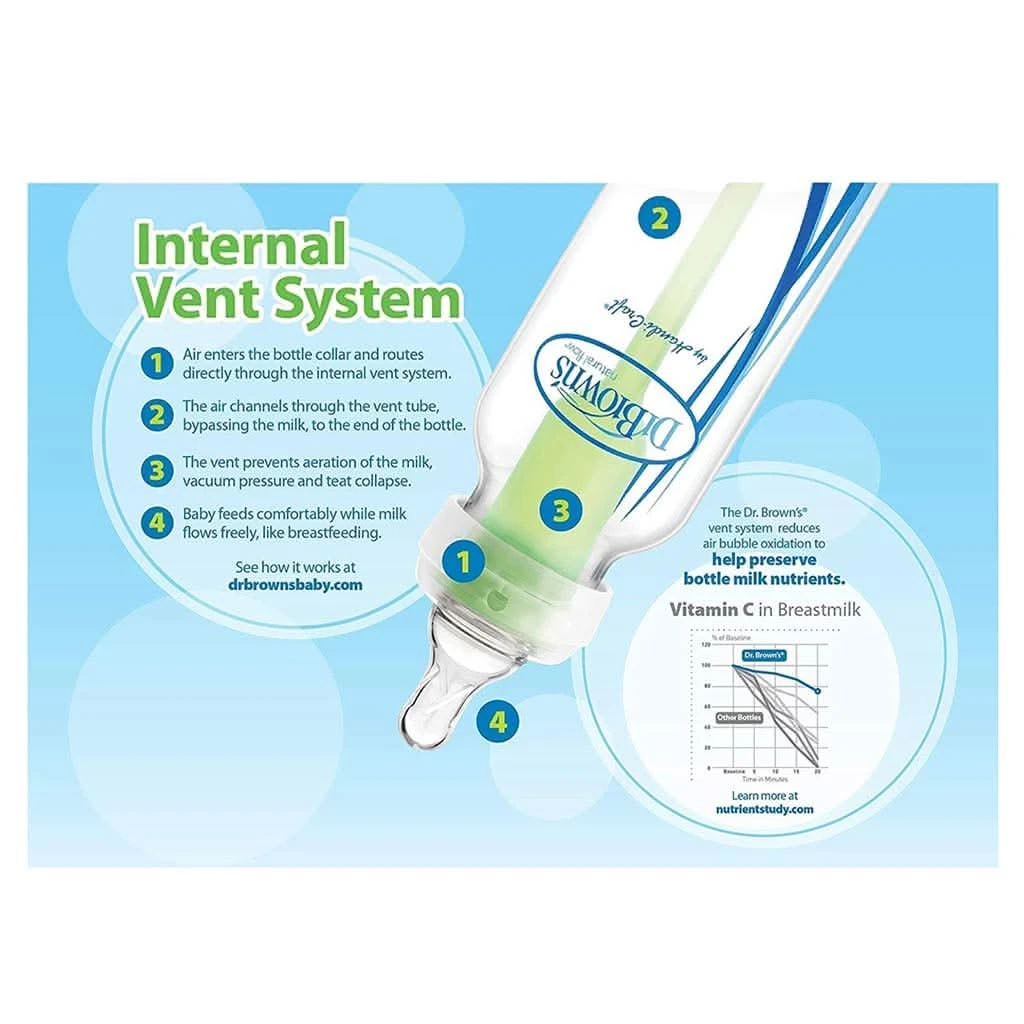 Clinically proven to reduce colicDr. Brown’s baby bottles are fully-vented and clinically proven to reduce colic.* Dr. Brown’s anti-colic internal vent system helps prevent ingestion of air bubbles and eliminates the vacuum effect which helps reduce spit-up, burping and gas. It also means no nipple collapse or fluid buildup in baby’s ear. |