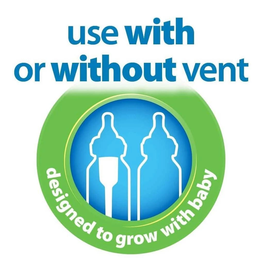 It’s Great to Have Options+Our bottles work best with the vent system in place but it’s great to have options when the baby’s feeding develops. Just remove the vent when you feel it’s time – no need to introduce a different bottle. Our bottle nipples feature their own venting system that offers a feeding experience similar to most nipple-vented bottles. |