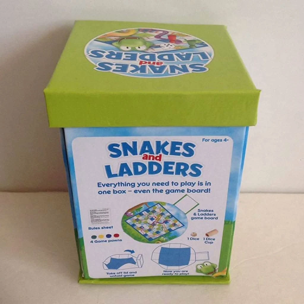 International Playthings Gamekeepers Snakes and Ladders Everything you need to play is in one box! Unfold the box- it’s the game board! Flatten it on the table, and you are ready to play! Small enough to take wherever you go. Open the lid to find the game pieces stored inside.