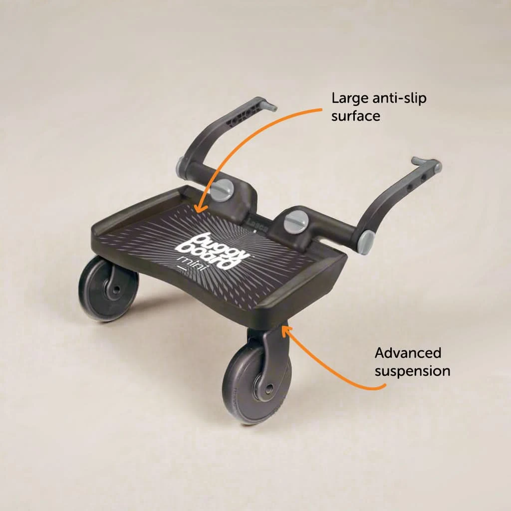 The BuggyBoard Mini features a sleek, space-saving design that seamlessly integrates with strollers without adding bulk. The durable, recyclable plastic construction ensures long-lasting use, while the fun and playful patterns add a touch of style. Its suspension system provides a smooth ride even on uneven surfaces, and the easy-fit system allows compatibility with most standard strollers. Whether used as a primary mode of transport for a tired toddler or as a backup option for longer outings, this ride-on board enhances stroller usability and convenience. It is suitable for children aged 2 to 6 years and is perfect for family outings, shopping trips, or travel.