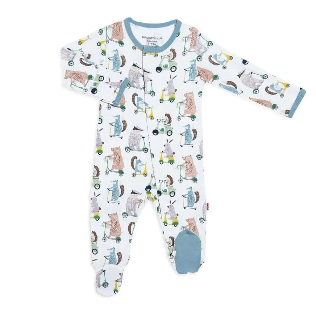 The Magnetic Me Blue Wheel Good Friend Modal Magnetic Footie is a soft and comfy outfit created for babies, ideal for both day and night. Its magnetic fasteners make changing quick and hassle-free just open the outfit, lay the baby in, and the magnets do the rest! Made from eco-friendly Modal fabric, Modal fabric is made from sustainably harvested beechwood, offering a long-lasting, soft, and durable fabric. It’s lightweight, breathable, and helps regulate temperature. Ethically produced without releasing harmful chemicals, it’s 100% bio-based, as rated by the USDA, and resists pilling and fading over time.