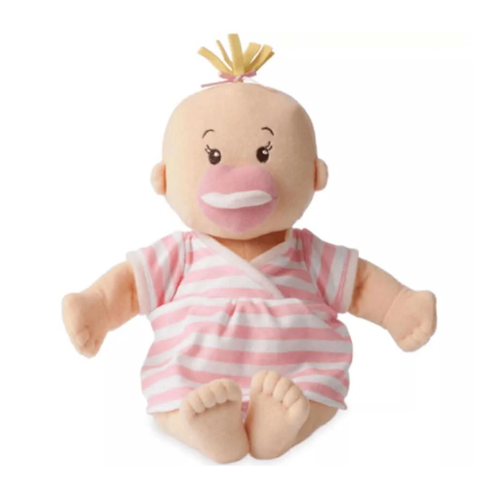 Baby Stella Peach Soft Nurturing Doll includes a removable diaper, a one-piece outfit with a hook and loop closure, and a pacifier that attaches magnetically to her mouth. Baby Stella by Manhattan Toy is an ideal first baby doll collection that will encourage little ones to role play, nurture, and care. Baby Stella dolls are completely soft and beautifully crafted with life-like details such as a belly summary and a perfectly plump tummy. You can change her outfits and every doll comes with a magnetic pacifier. This unique collection of baby dolls also offers a variety of soft and safe doll accessories that allow little ones a caregiving experience.