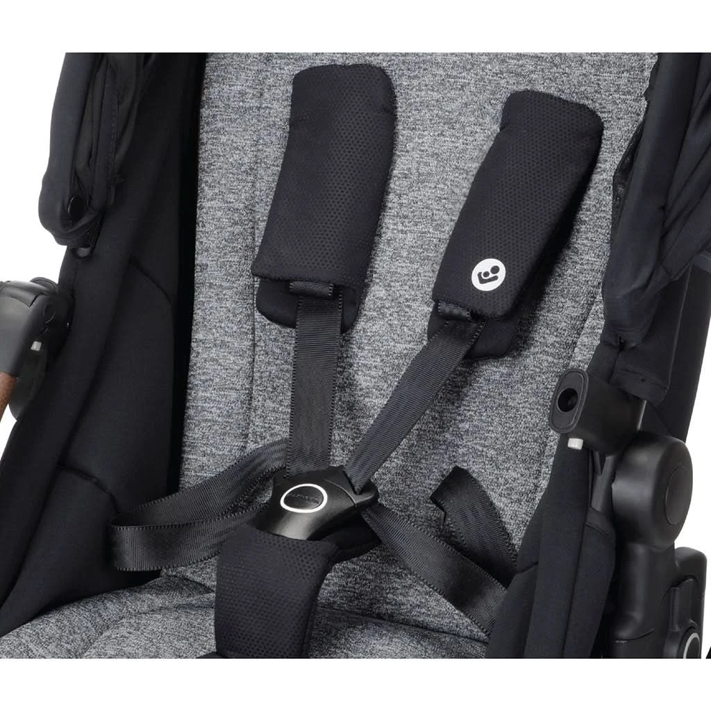 - Vegan-leather bumper bar: Swings aside for easy access to your child.