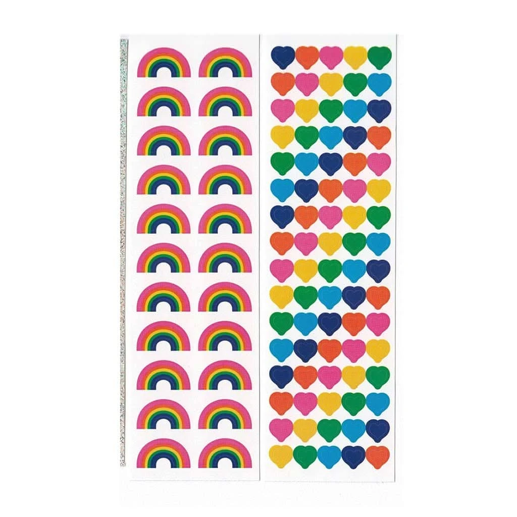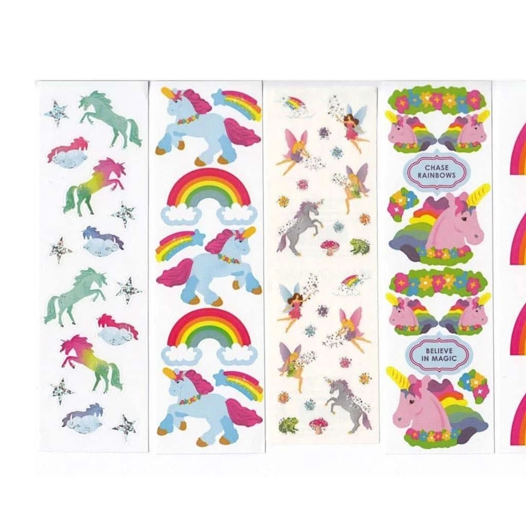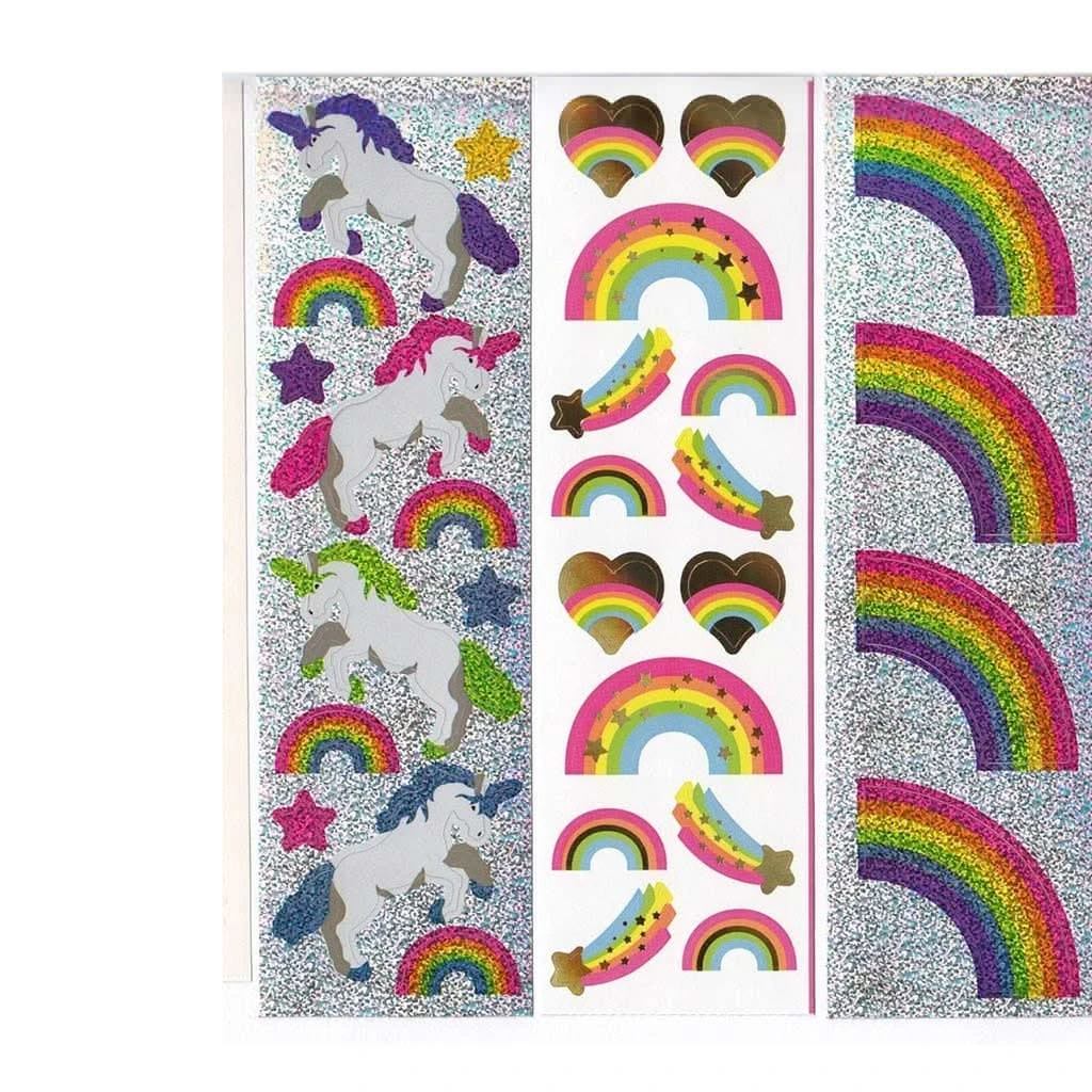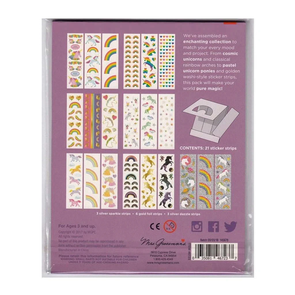 This is a pack of Mrs. Grossman’s unicorn and rainbow themed sticker strips. The package includes 21 sticker strips, 325 stickers total, some are glitter / foil / pastel / silver / gold.