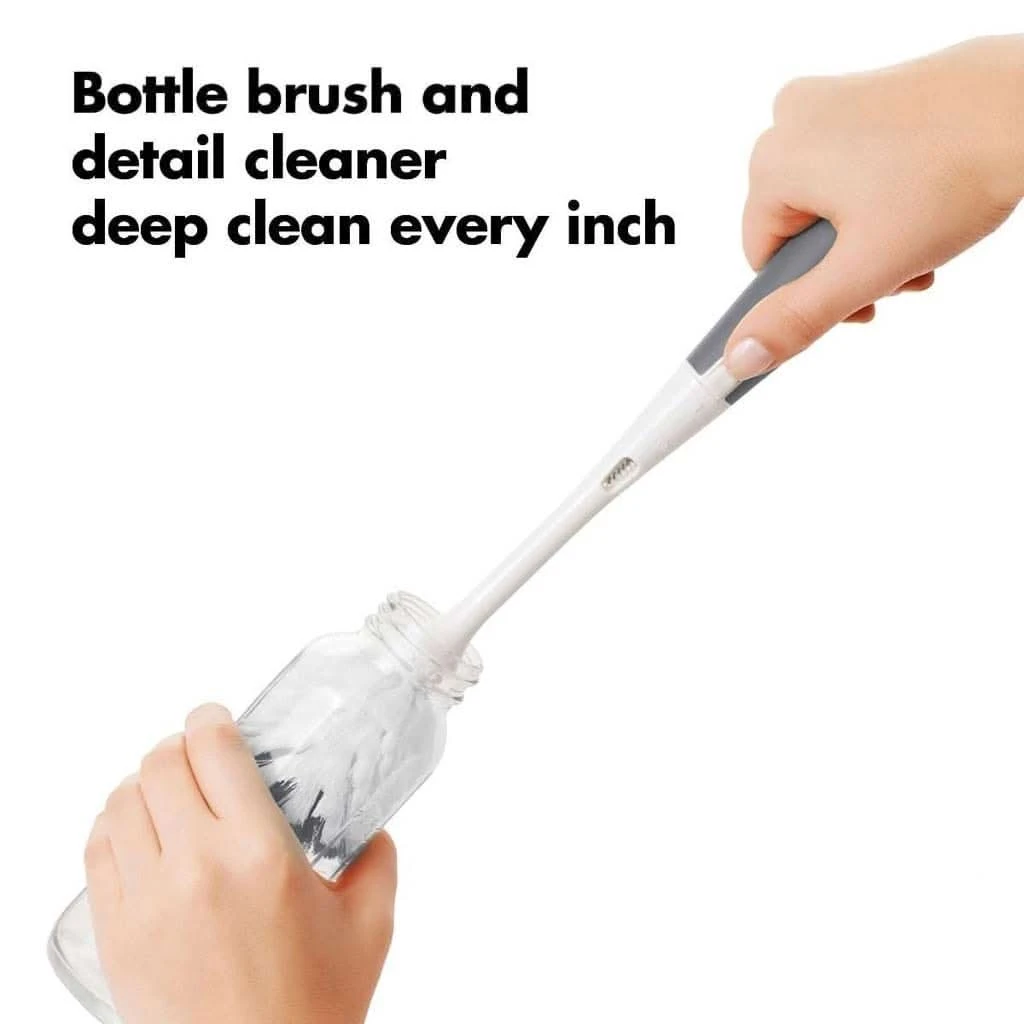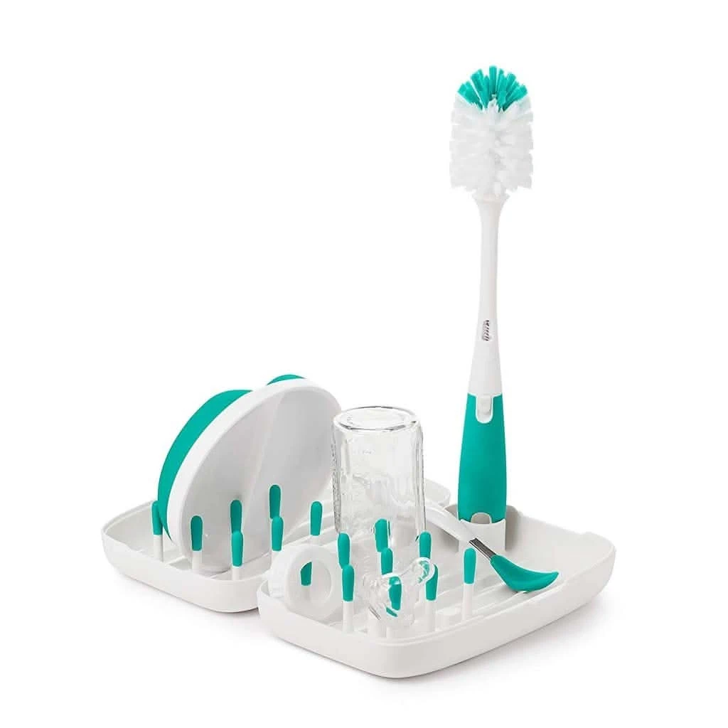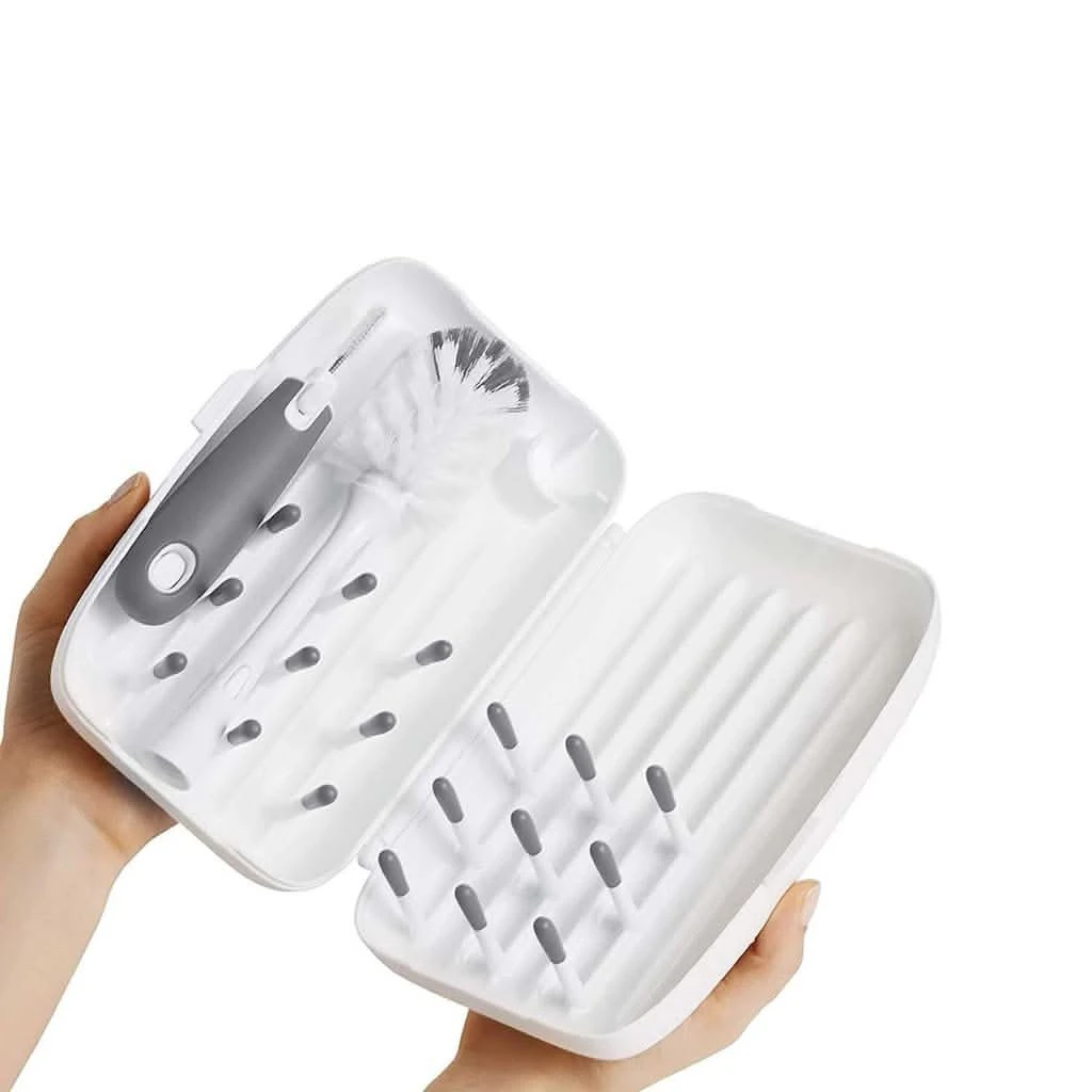Make cleaning up away from home less of a chore with the OXO tot travel drying rack and bottle brush. This compact cleaning kit is small enough to easily fit into diaper bags or purses while on the road. It opens up into a drying rack with flexible tines to accommodate bottles, nipples, breast pump parts and more. Neatly tucked inside the folded drying rack are a silicone detail cleaner and bottle brush head that assemble to form a full sized bottle brush. The brush has soft and firm bristles for gentle cleaning or serious scrubbing and has a soft handle that is non-slip, even when wet. The silicone detail cleaner cleans tight spots like bottle nipples and breast pump parts more effectively than bristles can. The ventilation holes provide aeration for quick drying, so you can say good-bye to wet brushes in inconvenient plastic bags.