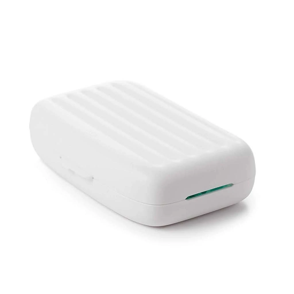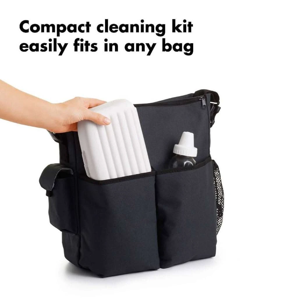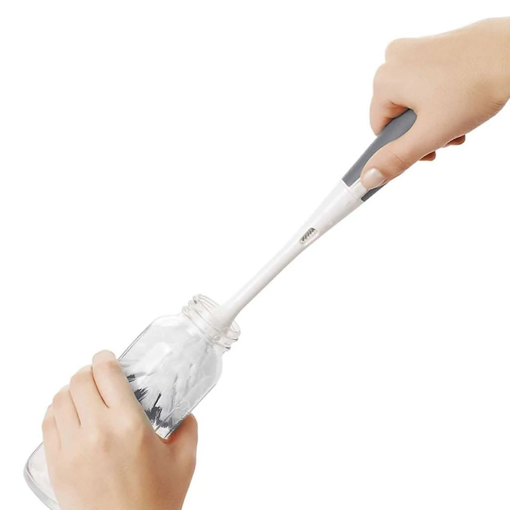 Make cleaning up away from home less of a chore with the OXO tot travel drying rack and bottle brush. This compact cleaning kit is small enough to easily fit into diaper bags or purses while on the road. It opens up into a drying rack with flexible tines to accommodate bottles, nipples, breast pump parts and more. Neatly tucked inside the folded drying rack are a silicone detail cleaner and bottle brush head that assemble to form a full sized bottle brush. The brush has soft and firm bristles for gentle cleaning or serious scrubbing and has a soft handle that is non-slip, even when wet. The silicone detail cleaner cleans tight spots like bottle nipples and breast pump parts more effectively than bristles can. The ventilation holes provide aeration for quick drying, so you can say good-bye to wet brushes in inconvenient plastic bags.