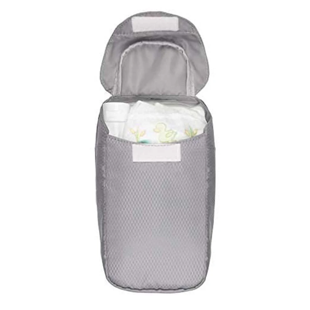 - 2-in-1 Case features hard dispenser for wipes and fabric pouch for up to 5 diapers