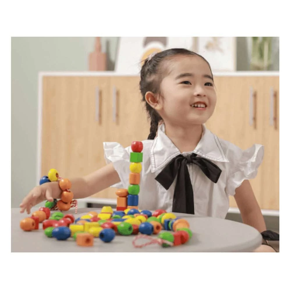 The Viga Toys Wooden Lacing Beads, 90-Pieces and 5-Cords is a jumbo tub of brightly colored wooden beads are educational as well as fun! Children can create endless different designs by threading the wooden beads along the lace and combining the different shapes and colors.Â